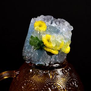 Sculpture for Photograph, Materials: Ice, Yellow Button Matricaria, Amber Glass Teacup. Created March 9th, 2021.