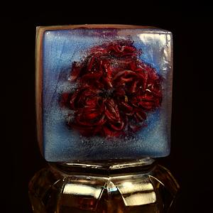 Sculpture for Photograph, Materials: Ice, Ranculus, Aqua Spirulina, Red Beet Powder, Carnival Glass. Created January 25th, 2022.