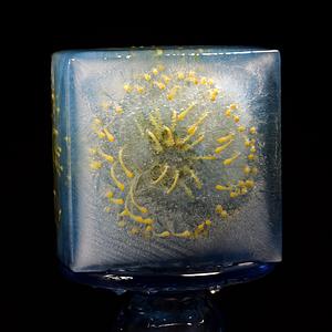Sculpture for Photograph, Materials: Ice, Aqua Spirulina, Yellow Pin Cushion Flower, Blue Glass Vase. Created October 4, 2022.