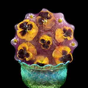 Sculpture for Photograph, Materials: Ice, Yellow Pansies, Chamomile, Beet Powder, Green Glass Dish. Created August 4, 2022.
