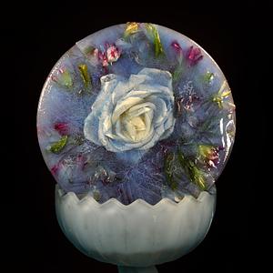 Sculpture for Photograph, Materials: Ice, Aqua Spirulina, Cream Rose, Alstroemeria, Frosted Blue Glass Dish. Created March 17th, 2022.