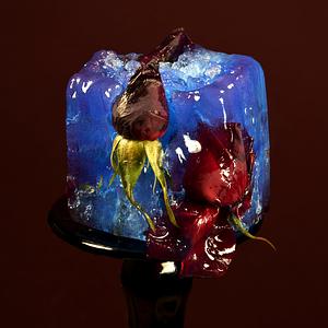 Sculpture for Photograph, Materials: Ice, Three Red Roses, Blue Butterfly Pea Powder, Aqua Spirulina, Brown Stemware. Created March 3, 2021.