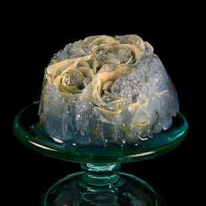 Sculpture for Photograph, Materials: Ice, Cream Roses, Blue Butterfly Pea Powder, Green Glass Ice Cream Dish. Created March 16th, 2021.
